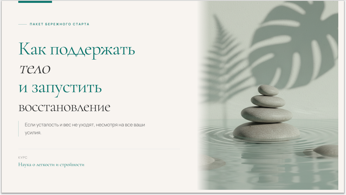 Мы знаем, как сложно решиться на что-то новое, особенно если раньше уже были попытки, которые заканчивались усталостью и разочарованием. Поэтому как дополнительную заботу и поддержку мы разработали пакет бережного старта — два самостоятельных гайда, которые помогают войти в процесс спокойно и чувствовать себя увереннее с первых шагов. Сейчас этот пакет доступен участникам курса с оплаченным полным доступом и уже размещён в меню бота. Что входит в пакет: Гайд №1 — про мягкий старт восстановления. Мы показываем, как начать без давления и разбираем самые частые ошибки, из-за которых многие перегружают себя уже в начале пути. Этот гайд помогает выстроить старт без жёсткого контроля и лишнего напряжения. Гайд №2 — про поддержку во время болезни и слабости. Когда состояние меняется и привычный ритм временно недоступен. Как действовать в такие периоды, чтобы поддержать организм и не чувствовать, что всё «пошло не так». Мы сделали эти гайды, потому что понимаем, сколько вопросов и сомне