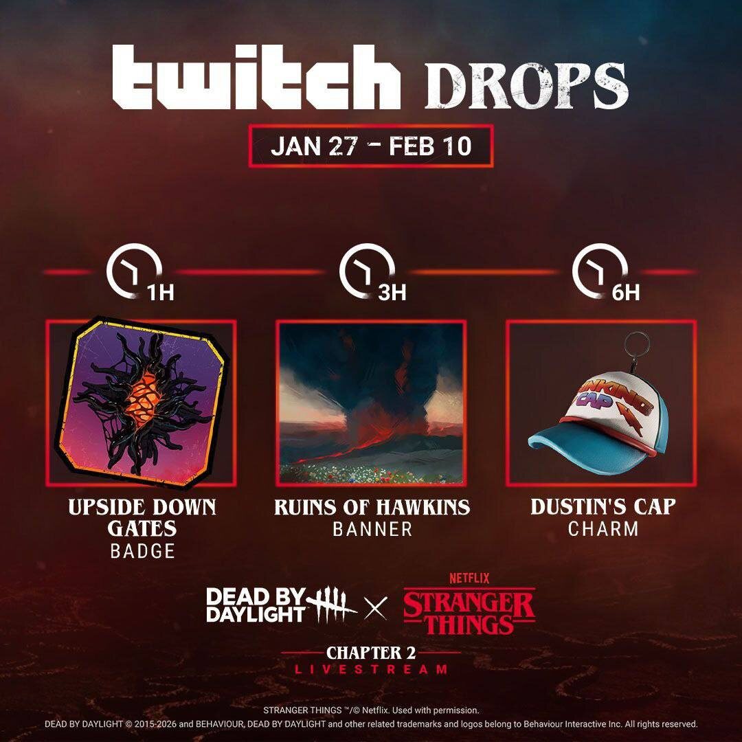 Создайте свою учетную запись Behaviour прямо сейчас, чтобы начать получать эти награды 27 января в 19:00 МСК во время прямой трансляции Dead by Daylight: Stranger Things Chapter 2. Награды можно получить в период с 27 января по 10 февраля 1 час просмотра - значок 3 часа просмотра - баннер 6 часов просмотра - амулет Отправил @RoMango_ez через @dbd440bot 🔪 Подписаться | ⚡️Голосовать #deadbydaylight #дбд #dbd #news #dbdnews #новостидбд #предложка #twitch #drops