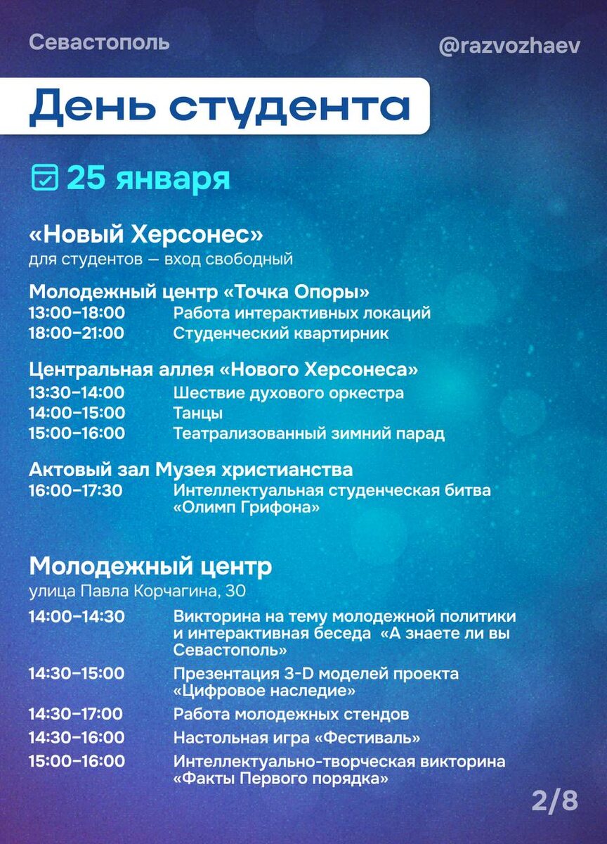 ✅ Самым ярким станет празднование в Новом Херсонесе Дня студента — Татьяныного дня. ✅ В библиотеках, сельских клубах и домах культуры пройдут кинопоказы, творческие мастер-классы, познавательные и литературные программы. ✅ В поликлинике № 3 на улице Бориса Михайлова будет организована диспансеризация взрослого населения. Пришедшим проведут репродуктивный скрининг, биохимический анализ крови, ФЛЮ и маммографию. Также можно получить консультации терапевта и узких специалистов. ✅ В субботу ветеринары проведут выездную вакцинацию собак и кошек против бешенства. Полное расписание мероприятий на карточках,прикрепленных к этому посту. Севкор теперь в MAX 👉 😍😍Читайте Севкор