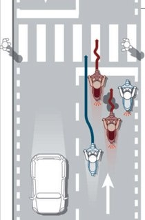 Зебра. Пешеходы – это самые легко уязвимые участники дорожного движения. Приостановитесь, подъезжая к пешеходному переходу, заметив пешеходов, намеревающихся перейти дорогу, это один из признаков культуры вождения. Хороший мотоциклист всегда уступит дорогу пешеходу, чтобы показать, что на двух колесах и в шлеме ездят вовсе не «плохие парни». Также не следует резко тормозить, потому что вы (водитель) знаете, что успеете остановиться, однако пешеходу это может показаться неочевидным. Кроме того не стоит резко тормозить рядом с зеброй, т.к. на данной поверхности дороги сильное скольжение. Когда вы останавливаетесь перед пешеходным переходом, вставайте в крайнюю правую полосу, велика вероятность того, что какой-нибудь менее социальноответственный или просто непутевый водитель, не остановится и, чтобы избежать наезда, вывернет резко руль, не приняв вас во внимание.