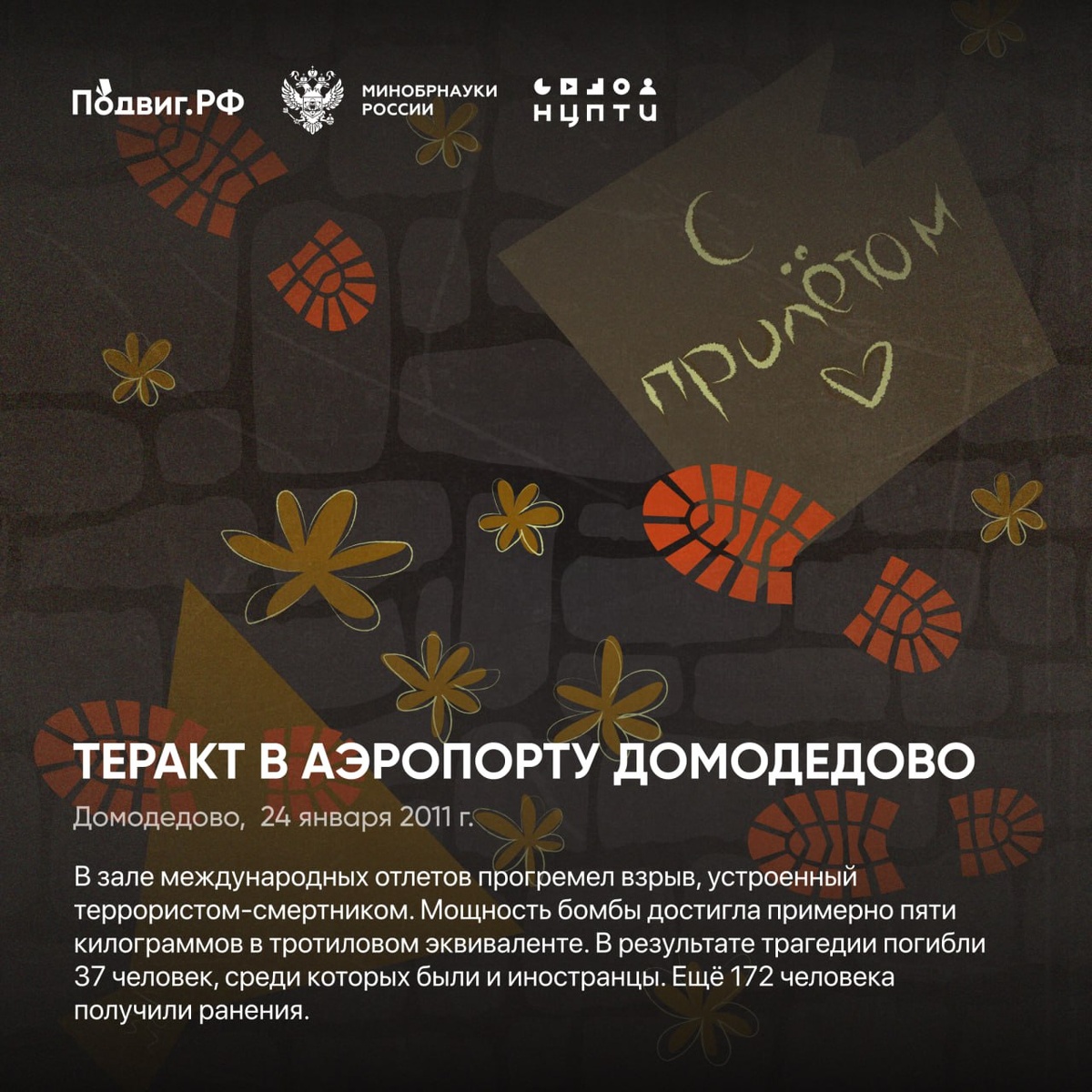 В 2011 году в результате взрыва в Домодедово, устроенном террористом-смертником, погибло 37 человек. Предлагаем послушать рассказ от Подвиг.РФ о страшном событии современной истории России: vk.cc/cTrc1g. Рассказ «Выход за рамки металлодетектора» входит в серию аудиовизуальных плакатов «Истории трагических событий», где собраны рассказы о 15 крупнейших терактах в истории России. Ссылка на выставку: vk.cc/cOVM2G. 💬 НЦПТИ 📲 Мы в МАХ | #нцпти_события #ПодвигРФ #антитеррор