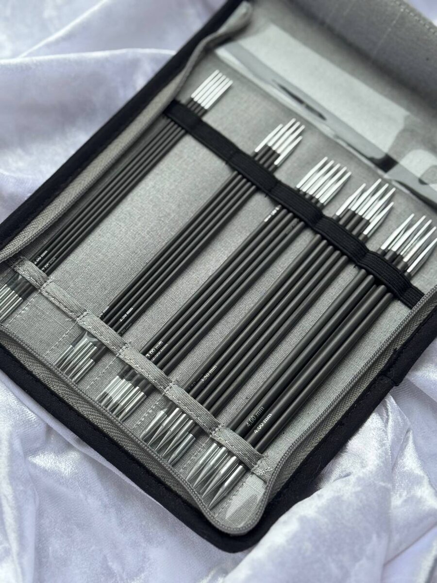 Продаются они всегда комплектом по 5 штук. Четыре из них образуют «рабочий квадрат», на котором распределены петли, а пятой — вы вяжете по кругу. Изначально они созданы для вязания небольших округлых деталей без шва. Но на самом деле их применение куда шире! Что на них вяжут? Идеи для проектов: ✅ Носки, гольфы, следки — классика жанра! Шов на носке — это кошмар, а тут он просто отсутствует. ✅ Варежки и перчатки — особенно удобно вывязывать пальчики. ✅ Шапки, бини, береты — от начала и до самой макушки. Идеально для вязания сверху вниз. ✅ Воротник-хобот и водолазки — чтобы не сшивать потом длинный неудобный шов. ✅ Рукава — можно вязать их от проймы, распределив петли на 4 спицы. ✅ Декоративные элементы — шнуры, косы. Материалы из которых бывают чулочные спицы: алюминий (легкие, недорогие), сталь (скользкие, прочные), бамбук/дерево (теплые, петли не соскальзывают), пластик, карбон. Почему они нам нужны: · Бесшовное вязание. Ничего не нужно сшивать, изделие более аккуратное. · Мобил