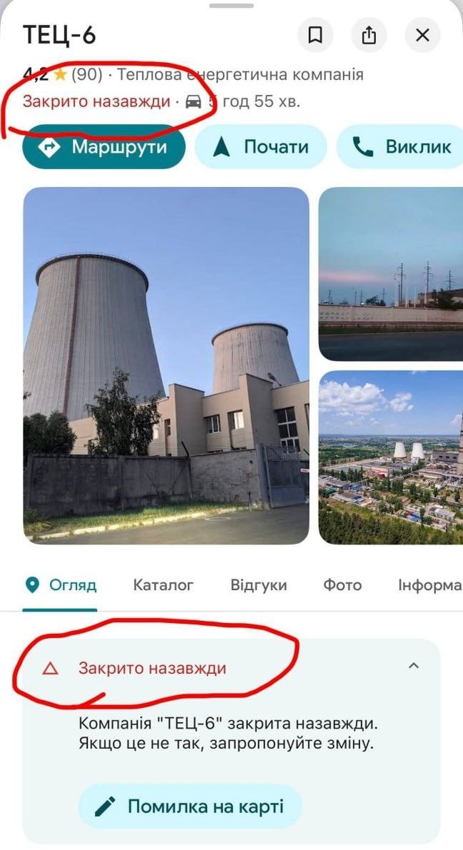 В киевких гугл-картах ряд объектов энергетики сменили информацию о своём режиме работы на "закрыто навсегда"