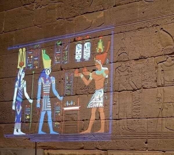 Вот как могли выглядеть иероглифы и фигуры в древнеегипетских храмах, прежде чем их краски выцвели.