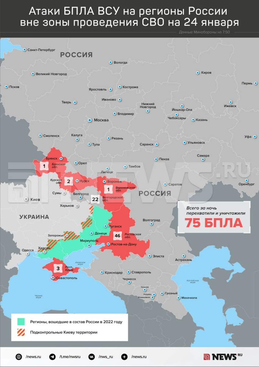 46 из них сбили над Ростовской областью, 22 — над Белгородской, еще три — над Крымом.
