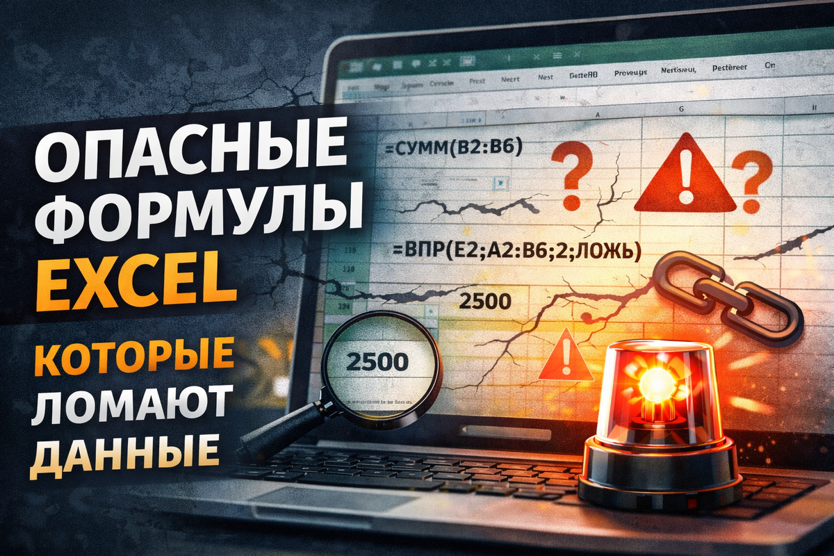 Часть 3. Формулы, которые тихо уничтожают данные. Опасные формулы в Excel, которые не выдают ошибок, но постепенно ломают отчёты. Почему цифры «сходятся», а доверие исчезает — разбор с примерами. Самые опасные формулы в Excel — не те, что выдают ошибку, а те, что работают. Без предупреждений, красных ячеек и намёка, что что-то пошло не так. Именно они разрушают данные тихо — шаг за шагом. Excel проверяет синтаксис, а не смысл. Если формула написана корректно, Excel: