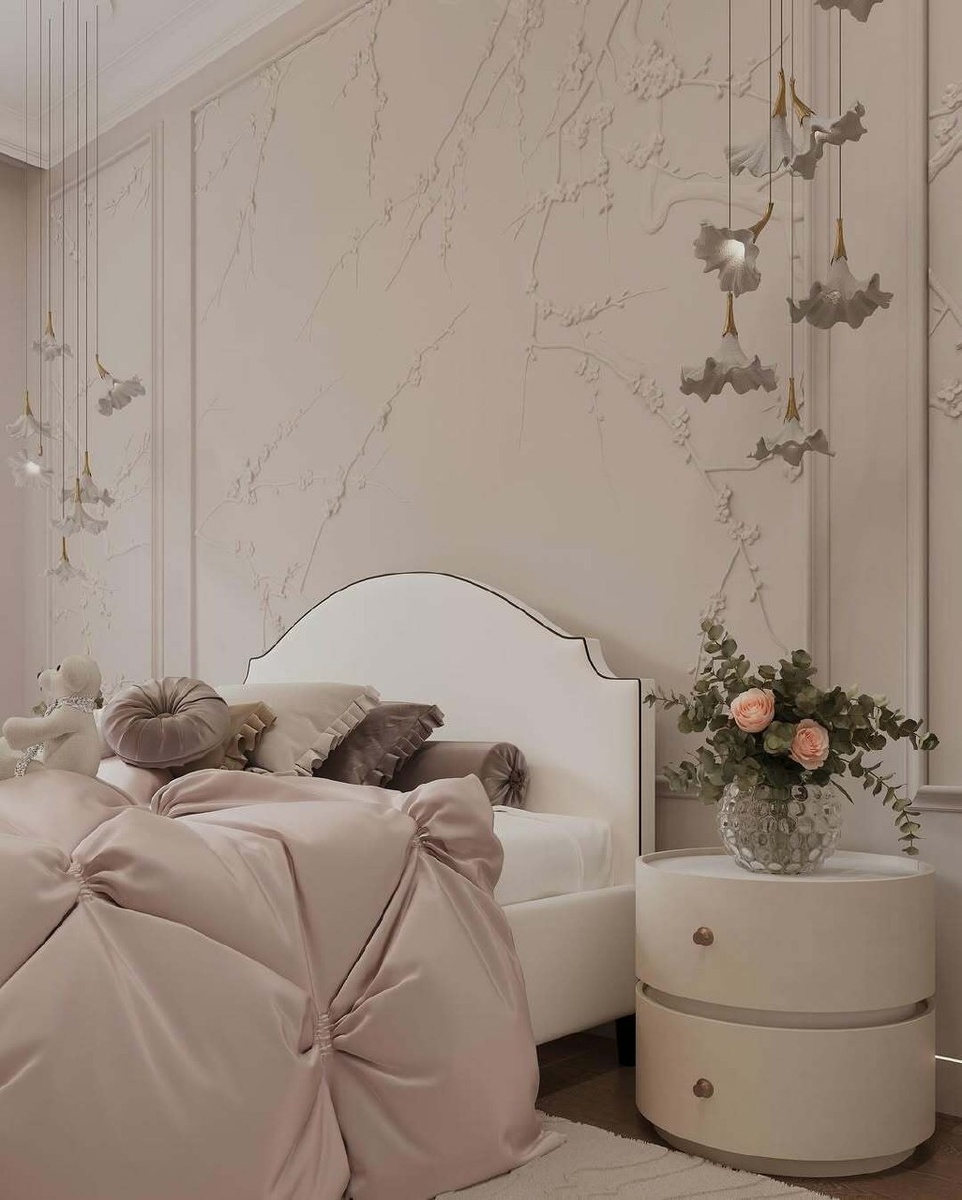 Эта изысканная спальня — воплощение нежности и элегантности, где каждая деталь продумана для создания особого настроения