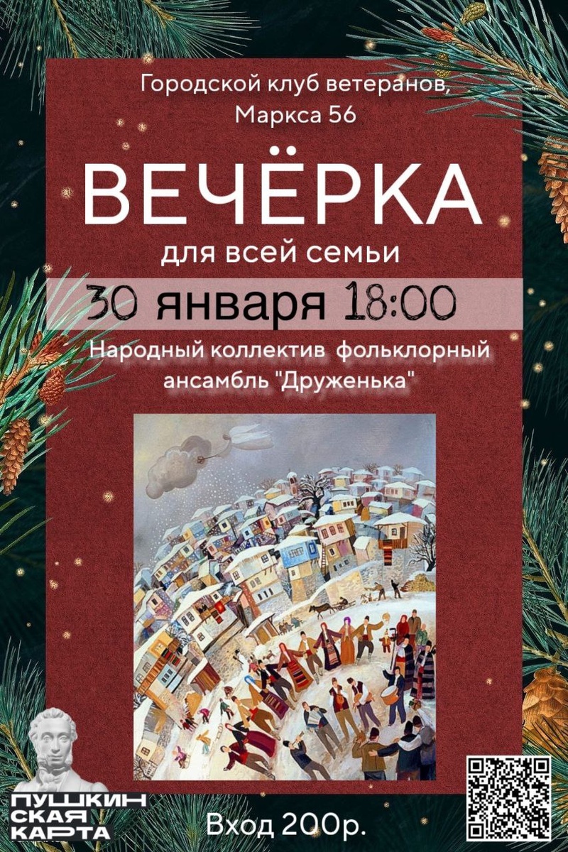 Народный коллектив фольклорный ансамбль «Друженька» (лауреат международных и всероссийских конкурсов). Зимняя ВЕЧЕРКА - Это один из способов возрождения традиционного русского досуга, интересная и увлекательная форма общения молодого поколения в народном стиле. На вечерке гости приобщаются к истории и культуре, знакомятся с уникальными русскими традициями. Танцевальные жанры: зажигательные хороводы и кадрили: «Калужская», «Волжская». Инструментальные наигрыши на гармони, баяне и балалайке: «Барыня», «Матаня». Игровой фольклор Вход по Пушкинской карте или онлайн оплате при входе - 200р https://vmuzey.com/event/koncert-zimnie-svyatki-ot-rozhdestva-do-kreshcheniya Обнинск, пр-т Маркса, 56, 2 этаж. 👍 Подписаться | Ваша реклама