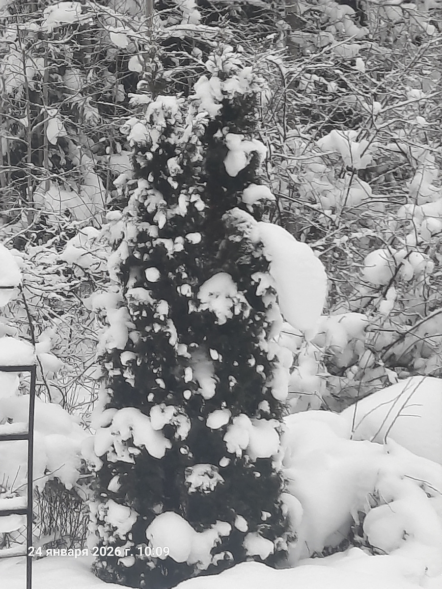 Нынешний январь выдался морозным и снежным. Так что в саду дел хватает и мужу, и мне. Муж чистит снег на дорожках, а я своими садовыми занимаюсь. Видите, на большой туе одна макушка "налево" решила пойти. Это я утром в окно изучала. Днем выбралась, одевшись потеплее и обувшись повыше, потому как снега почти по колено. Думаю, когда потеплеет, сама макушка выпрямится. До нее только на стремянке можно добраться. Эти туечки были стряхнуты в прошлый раз. Новых шапок пока не накопилось, иду мимо. Вот такие шапки накопились на туе. Шарик связан, надеюсь выдержит. Но большое соскоблила до зелени. Барбарис нынче не связала почему-то... Стоит нынче вот такой расхристанный. На склоне кусты рододендрона и крыжовника выглядят сугробами. Мне туда даже лезть лениво, столько снега! Смородину тоже не связывала. Кусты развалены...Ну, весной видно будет. С гортензий метельчатых стряхнула шапки, чтобы не поломало. Маленькие шарики даже не видны под шапками снега. С одного стряхнула, а второй даж
