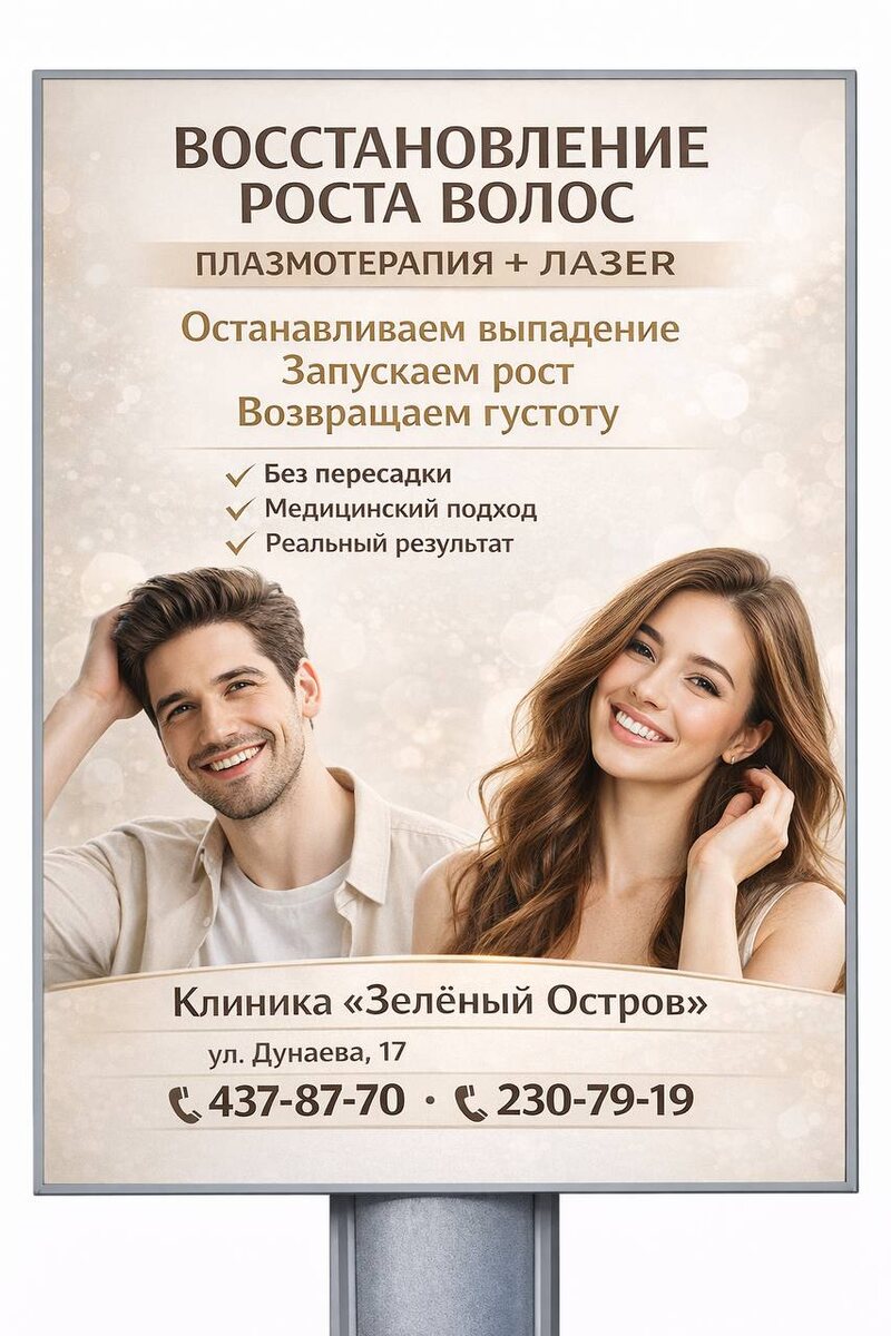 Без пересадки. Без «чудо-средств». С реальным результатом. ⸻ ПЛАЗМОТЕРАПИЯ + ЛАЗЕРНОЕ ВОЗДЕЙСТВИЕ Современный медицинский подход к остановке выпадения волос и стимуляции их роста. Что даёт процедура: • останавливает выпадение волос • активирует «спящие» волосяные фолликулы • увеличивает густоту и плотность • улучшает кровоснабжение кожи головы • замедляет возрастные и гормональные изменения Почему это работает: • Плазмотерапия запускает естественное восстановление за счёт собственных факторов роста • Лазер усиливает микроциркуляцию и питание корней • В комплексе — эффект выше, чем по отдельности ⸻ Кому подойдёт: • мужчинам и женщинам • при истончении, облысении, сезонном выпадении • после стресса, гормональных сбоев, ковида • при первых признаках залысин и потери объёма ⸻ Клиника «Зелёный Остров» 📍 Адрес: ул. Дунаева, 17 📞 Телефоны: 437-87-70, 230-79-19 Работаем по медицинским протоколам. Ин