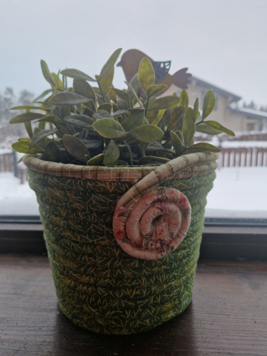 Люблю проверенные "рецепты". Не все, что я когда-нибудь делала, прочно обосновывается в моем доме. Бывает так, что вещь делается на пике эмоции. Например, хочется срочно освоить новую технику. Или жуть какая красивая штука, но потом носишься по дому "волосы назад" и не знаешь, куда это приткнуть. То ли по стилю не подходит, то ли цвета не те и т.д. А не редко бывает, что вещь просто не практично, хотя, изначально казалось... Ну, к примеру, я так и не прикипела к ланчматам (салфетки под обеденные приборы. Ни в этой жизни. В нынешней жизни ланчмат в течении первого же часа жизни будет улит борщем и сверху присыпан хлебными крошками. И плевать, что у меня на него ушли самые дорогие тканьки и шился он не одну ночь. Поэтому, я учусь сдерживать свои хотелки, и браться только за то, что реально может мне служить долго, а заодно и радовать глаз. Одна их таких работ - текстильное кашпо. Опять же, я напрягаюсь, когда вижу в сети образцы текстильных кашпо под... настоящими горшками с комнатными