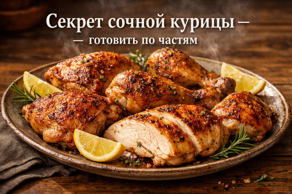 Знаете, есть такие моменты на кухне, когда вдруг понимаешь — годами делала что-то не так. Не то чтобы плохо, просто можно было лучше. У меня такое озарение случилось с обычной запечённой курицей. Казалось бы, что тут сложного? Купила тушку, натёрла специями, отправила в духовку. Но каждый раз получалось одно и то же: грудка сухая, а у бедра мясо ещё розовое возле кости. Муж деликатно отодвигал белое мясо на край тарелки, дети просили только ножки, а я расстраивалась и не понимала, в чём дело.