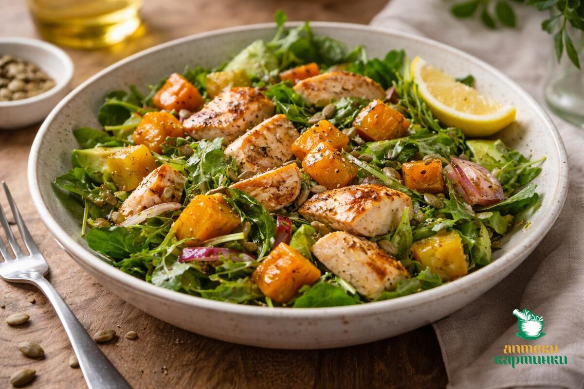 Когда хочется по-домашнему вкусно, но без «потом полежу» 😌 🥗 Тёплый салат с курицей и тыквой Сытный, но не тяжёлый. Подходит и для обеда, и для ужина. Что нужно (быстро и без экзотики,на 2 порции): ➖ Тыква — 250 г • очистить, нарезать кубиками 2 см ➖ Куриное филе — 250 г • полосками или небольшими кубиками ➖ Руккола или микс салатов — 50–70 г ➖ Фета или мягкий сыр — 50 г • крошкой ➖ Оливковое масло — 2 ст. л. ➖ Мёд — 1 ч. л. ➖ Лимонный сок — 1 ст. л. ➖ Соль, чёрный перец — по вкусу ➖ Паприка или тимьян — ½ ч. л. Как готовить: 1️⃣ Тыкву выложите на противень, сбрызните 1 ст. л. масла, посолите, добавьте паприку. Запекайте 20 минут при 190 °C, до мягкости и лёгкой румяности. 2️⃣ Курицу обжарьте на сковороде с 1 ст. л. масла до готовности, слегка подсолите и поперчите. 3️⃣ В миске смешайте мёд + лимонный сок + щепоть соли — это заправка. 4️⃣ Выложите на тарелку листья салата, сверху — тёплую тыкву и курицу. 🏁 Добавьте фету, полейте заправкой. Почему это ЗОЖ, а не просто вку
