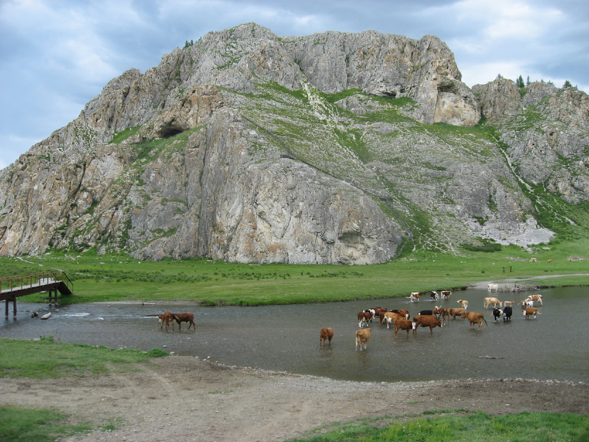 Республика Алтай Бийск - с. Усть-Кан - 260 км Все дороги в Горный Алтай ведут через Бийск. Мы отправляемся в Усть-Коксу и далее, за Тюнгур. По пути хотели увидеть что-нибудь интересное и нам повезло. Бийск-Сростки - Майма - Манжерок - Усть-Сема - Шебалино - Семинский перевал - Нефтебаза - Усть Кан - Усть -кокса - Тюнгур. В 3,5 км от села Усть-Кан на правом берегу реки Чарыш, вблизи тракта на Усть-Коксу, на горе Белый камень находится пещера. Эту гору и пещеру в ней отлично видно с трассы. Чтобы добраться до пещеры, нужно пройти по мосту через Чарыш и подняться на 50 метров по деревянной лестнице. Мы по этой лестнице поднимались дважды, потому как, дважды путешествовали за Тюнгур и каждый раз делали остановку у горы Белый камень. Первый раз нам повезло больше. Нам провели очень интересную и познавательную экскурсию. К сожалению я не помню фамилию экскурсовода. В зелёной футболке экскурсовод. Экскурсовод рассказывает, что первые археологические раскопки в пещере начались в 1954 году