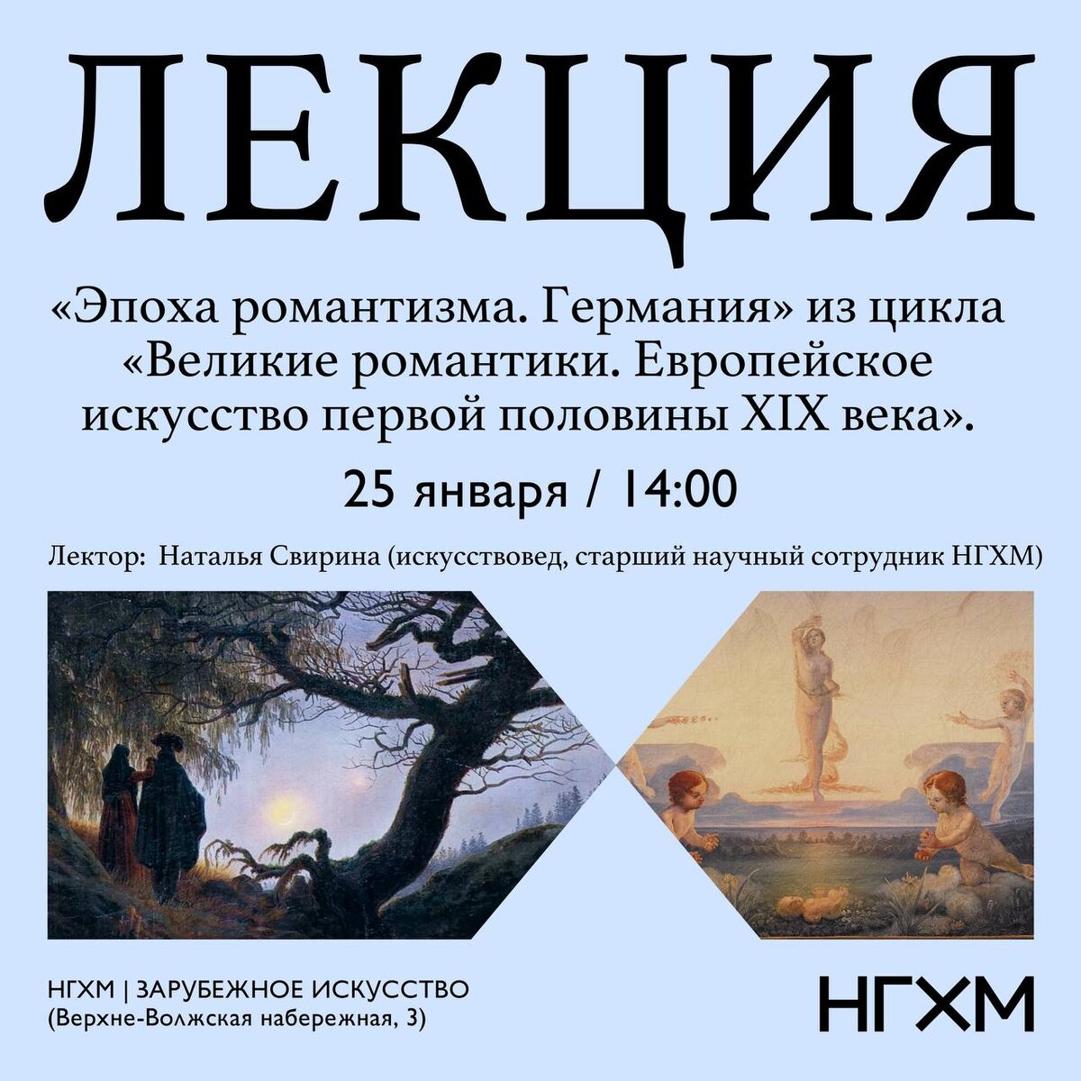 Германия» из цикла «Великие романтики. Европейское искусство первой половины XIX века». В начале XIX века Германия переживает яркий расцвет романтизма. Это течение пронизало все сферы культуры – философию, поэзию, изобразительное искусство и музыку. На лекции мы проследим, как древние легенды, образы Средневековья и Востока сформировали уникальный немецкий романтизм. От художников-«назарейцев» до Каспара Давида Фридриха и Филиппа Отто Рунге – поговорим о главных именах и шедеврах эпохи. 25 января в 14:00 НГХМ | ЗАРУБЕЖНОЕ ИСКУССТВО (Верхне-Волжская набережная, 3) Лектор: искусствовед, старший научный сотрудник НГХМ Наталья Свирина Приобрести билет в кассе музея 😄 Мероприятия Нижний Новгород. Я местный! 📱 Telegram | 📲 MAX