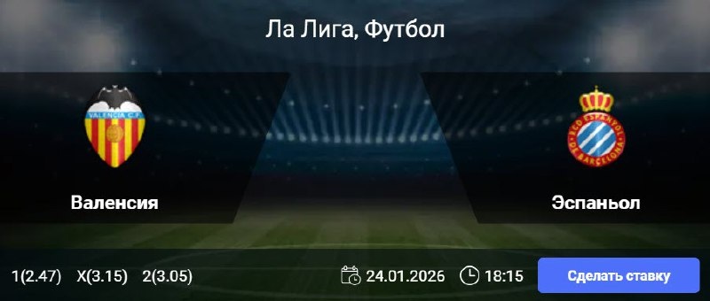 Статистика Валенсии: В девяти из десяти предыдущих домашних матчей «Валенсии» в чемпионате было забито как минимум два мяча. На своем поле команда не проигрывает в рамках турнира на протяжении пяти встреч, одержав одну победу и четырежды сыграв вничью. Клуб не забивает более одного гола в последних четырнадцати играх Примеры. Статистика Эспаньола: В шести из семи последних выездных матчей Примеры клуб не потерпел поражений, одержав четыре победы и дважды сыграв вничью. Гостевая результативная серия каталонцев в чемпионате насчитывает шесть игр. В шести из семи предыдущих поединков «Эспаньола» в Ла Лиге было забито не более двух голов. 🎯 Обе забьют (Да) 🎲 кф (1.93) 👉 СДЕЛАТЬ СТАВКУ 🎁 ФРИБЕТ WINLINE - 3000₽ (промокод: BETWIN) 👉 СМОТРЕТЬ ПРОГНОЗ 👇 Подпишись на нас 🧿 ВКонтакте 👉 Телеграм 📎 Сайт