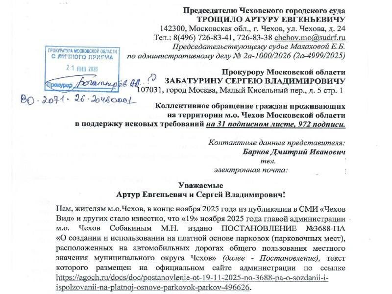 В муниципальном округе Чехов разгораются страсти вокруг платных парковок. Почти тысяча жителей округа (а точнее, 972 человека) обратились с коллективным заявлением к руководству Чеховского городского суда и областной прокуратуры. Причина недовольства – постановление о введении платных парковочных мест на улицах Дружбы и Первомайской. Особую тревогу вызывает тот факт, что платные парковки планируется организовать в непосредственной близости от социально значимых объектов. Жители считают, что такой шаг нарушает их конституционные права на свободу передвижения, гарантированные ст.27 Конституции РФ. Стоит отметить, что в производстве чеховского судьи Малаховой уже имеется аналогичный иск, который подписан 24 жителями округа. Ответчиками по делу являются администрация и глава Чехова. Подан он был 19 ноября, и предварительное судебное заседание по нему назначено на 5 февраля. Почти тысяча жителей, чьи подписи стоят на новом заявлении, просят присоединить их иск к предыдущему. В суде приня