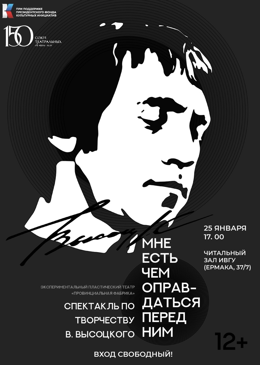 25 января в читальном зале ИвГУ пройдет вечер, приуроченный к 87-летию со дня рождения актера, поэта и певца Владимира Высоцкого. Откроет мероприятие известный ивановский исполнитель Роман Холодов. Участники Студенческого клуба ИвГУ прочитают стихи Высоцкого. А экспериментальный пластический театр «Провинциальная фабрика» покажет спектакль «Мне есть, чем оправдаться перед Ним», в основе сюжета которого — судьба артиста. Вход свободный. Необходима регистрация: https://forms.yandex.ru/u/696f2afc4936396bd85b4d23/. (12+) Фото: ИвГУ
