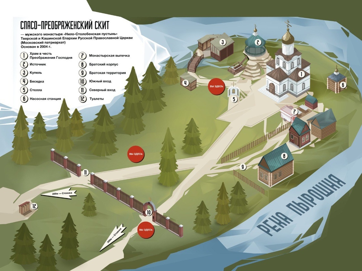 Нило Столобенская пустынь — живописный православный мужской монастырь. Он располагается на острове Столбном и частично на полуострове Светлица, в десяти километрах к северу от Осташкова, на озере Селигер. Коллективом ООО «827» было выполнено два небольших проекта для Спасо-Преображенского скита на Оковецком источнике: разработали навигационную карту и создали дизайн этикеток стикеров. Оковецкий источник представляет собой обширный водоём. В 1878 году его облицевали тёсаным гранитом и увенчали шатровым куполом. Благодаря поддержке благотворителей, местных жителей села Оковцы и братии Нило Столобенской пустыни на месте прежней часовни у святого источника был построен и освящён храм во имя Преображения Господня. Люди приезжают сюда, чтобы: побывать в святом месте; испить воды из источника; окунуться в купальню. Для тех, кто не может лично приехать к Оковецкому источнику, предусмотрена возможность приобрести чудотворную воду в бутилированном виде. Потому что очертания источника с высоты п