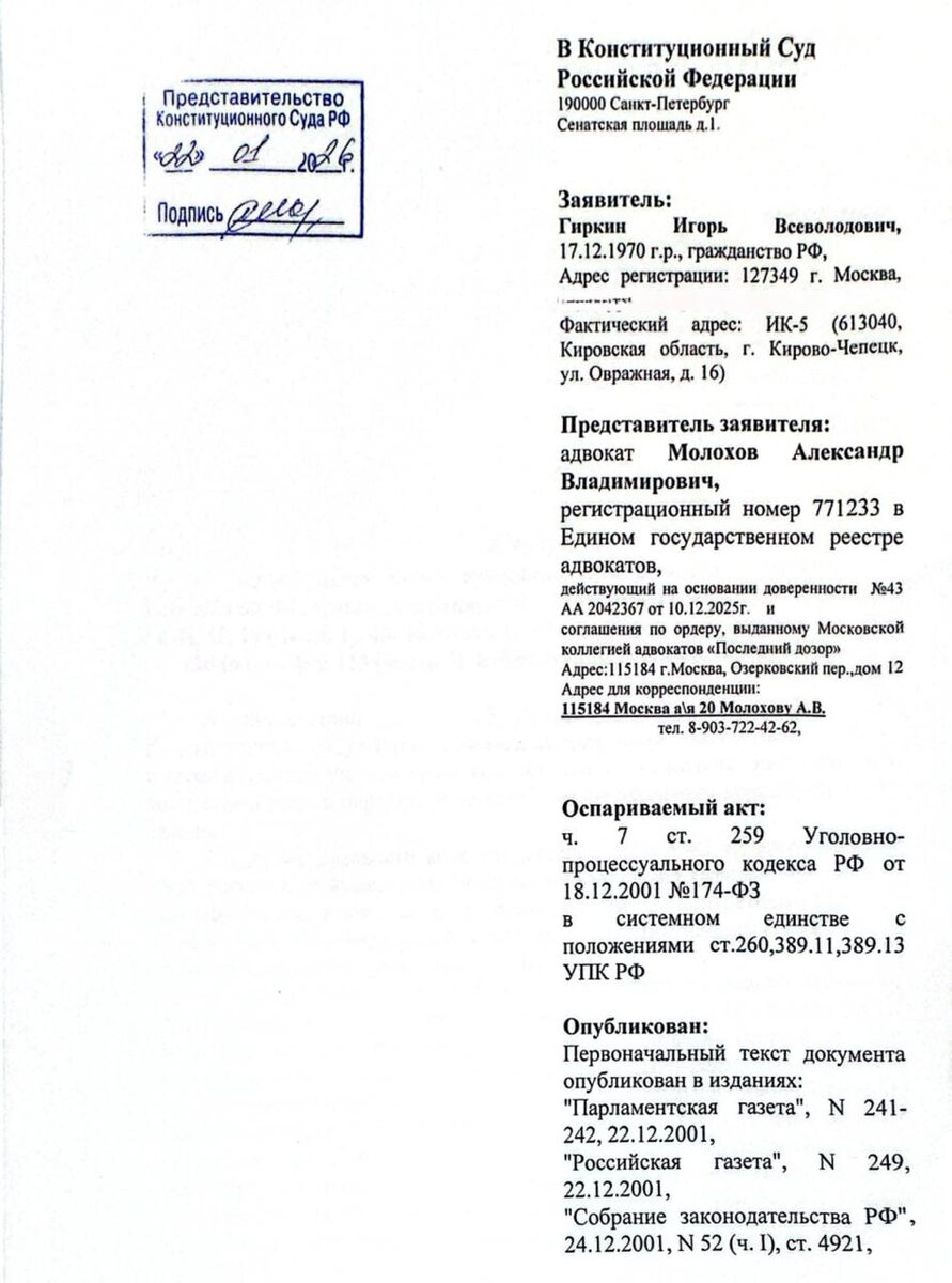 ⚡️ В Конституционный суд РФ подана жалоба по делу Игоря Стрелкова