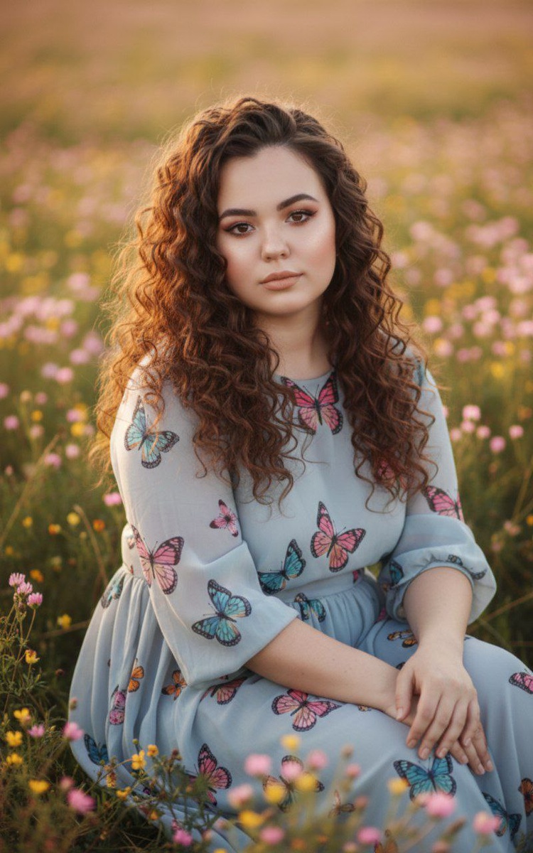 с длинными пышными кудрями. На лице профессиональный макияж, губы с нюдовым оттенком помады. Сидящая в поле диких цветов с розовыми и жёлтыми соцветиями; лёгкое серо‑голубое платье из тонкой ткани, украшенное яркими бабочками (розовые, голубые, жёлтые, оранжевые), руки сложены на коленях в расслабленной позе. Тёплый свет золотого часа, мягкая кинематографичная подсветка, нежные пастельные тона, глубокий боке на фоне, мелкие цветы на переднем плане для глубины. Фотореализм, высокая детализация волос и ткани, естественная кожа, приятная композиция по правилу третей, 35mm/50mm стиль портрета, f/1.8–2.8, мягкая ретушь, насыщенные но натуральные цвета, атмосферное, элегантное настроение." Опционально (негативные инструкции): "без текста, без водяных знаков, без лишних людей, без резких теней, без артефактов." #летние@annapromtii20 #женские@annapromtii20