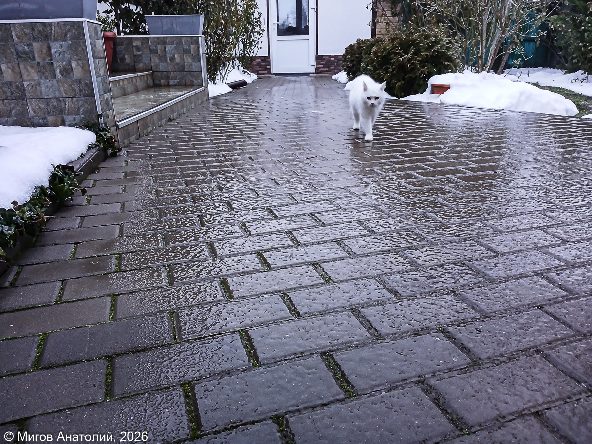 До обеда сидели в доме. Жуткий гололёд. Утром вышел, чтобы собачку прогулять, прошли с Тильдой двадцать шагов, я три раза едва не навернулся. Жене говорю: - Если жить не надоело, ты лучше из дома вообще не выходи. Самый большой недостаток тротуарной плитки - она может превратиться в каток. Ночью был туман, густой и тяжёлый, и температура воздуха чуть ниже нуля. Крыльцо тёплое, на нём вода. А ниже шагнул, нога поехала, едва не сел на шпагат. До того скользко, что хоть коньки надевай. Только у нас их нет. Не крымское это развлечение - катание на коньках. На ветках деревьев наледь. И с каждым часом слой увеличивается. В такую погоду электрические провода рвутся, свет в доме гаснет. Раньше у нас в Старом Крыму такое происходило регулярно. Но в последние годы всё реже. Наверное, все старые провода уже порвались и были заменены на новые, прочные. Кошка Маруся увидела, что я вышел во двор, тоже вышла из дома, чтобы поприветствовать меня (фото вверху). Неважно, что уже видела меня в доме и даж