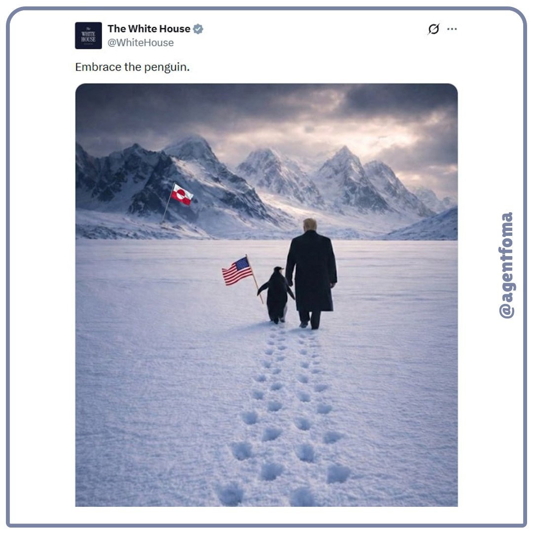 Белый дом взорвал соцсети провокационным коллажем: Дональд Трамп идёт по заснеженной Гренландии… в компании пингвина, держащего в клюве американский флаг. Подпись лаконична: «Обними пингвина». Но... Пингвины обитают в Южном полушарии (Антарктика) и в Гренландии не водятся! Пользователи соцсетей не упустили шанса пошутить: «Бро - это Антарктида». Тема Гренландии давно волнует Вашингтон - остров важен для военных стратегий США (в том числе для отслеживания подводных лодок). 👀 @agentfoma собирает новости от других агентов по всему миру... Подписывайтесь, чтобы не потерять!