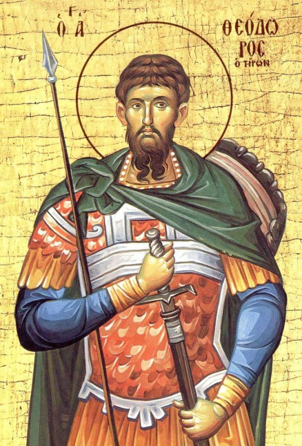 Феодор служил воином мармаритского полка в городе Амасии (Понт, Малая Азия). Прозвище «Тирон» (от лат. tiro — «новобранец») указывает на его начальный воинский статус. Во время гонений императора Галерия на христиан Феодора потребовали принести жертву языческим богам. Он отказался, после чего: Тело святого, не повреждённое огнём, погребла христианка Евсевия в городе Евхаитах. Позднее мощи перенесли в Константинополь, а главу — сначала в Бриндизи, затем в Гаэту. Священное Предание связывает с Феодором Тироном чудо во времена императора Юлиана Отступника (361–363). Юлиан приказал окроплять еду на константинопольских рынках идоложертвенной кровью, чтобы осквернить пост христиан. Во сне константинопольскому архиепископу Евдоксию явился Феодор Тирон и повелел: В память об этом в Православной церкви: Феодор Тирон олицетворяет: