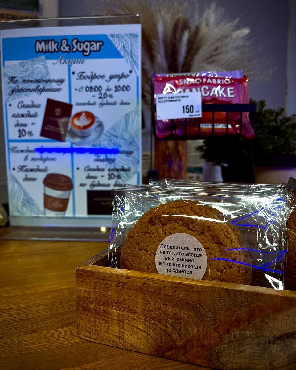 : сегодня весь день — вкусно и мотивирующе! 🌤️ Потому что у нас на прилавке поселилось волшебное печенье. Берешь его — и читаешь классную фразу. Съедаешь — заряжаешься энергией. Идеальное дополнение к любой кружке! Заходите, попробуйте «поймать» свою фразу на сегодня. А наш бариста приготовит для Вас кофе, который идеально подойдёт под Ваше настроение (или создаст нужное). Отличного дня, друзья! Пусть он будет продуктивным, а пауза в нём — вкусной. #milkandsugar #печеньесмотивацией #съешьпроблему #кофеипеченье #вкусныйперерыв #интересноевпитере