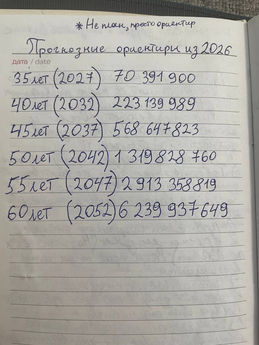 🪙 Раз в год я моделирую карту своего капитала по годам, сверяю компас 🧭 И вот на прошлой неделе мне на глаза попался новый калькулятор от Николая Мрачковского (у него есть свой канал на ютуб). Ранее я уже использовал первую его версию. Поэтому поспешил применить и вторую 😋 Работает он очень просто, вводим текущий капитал, доходы/расходы в мес, можно поиграться с инфляцией. Я выставил оптимистичный взгляд в 8% годовых (куда без оптимизма? 😁) и прирост доходов на уровне инфляции. Средний свой годовой доход выставил в 15%. И что у меня получилось: *Оговорка, я выставил текущий уровень развития, что я не двигаюсь(но и не падаю) дальше. По факту я расчитываю по возможности расти дальше, как по карьере, так и в расходах, поэтому оставлю уровень накопления на текущем уровне, лишь индексирую на инфляцию. 🟠40 лет (через 6 лет) 223 139 989 руб, Cash Flow в месяц 1 627 501 руб 🟠50 лет (16 лет) 1 319 828 760 руб, CF в мес 4 460 000 руб 🤯60 лет (26 лет) 6 240 000 000 руб, CF в мес 11 500