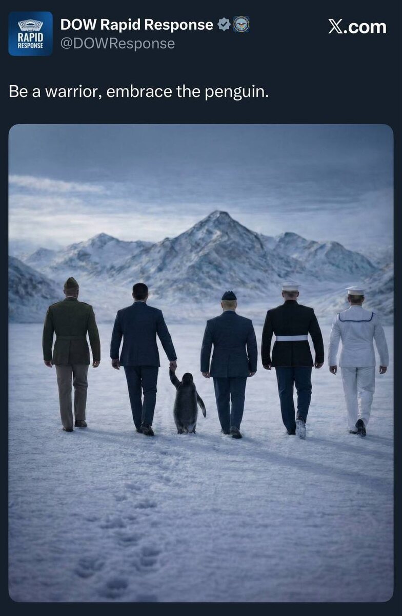» Минобороны США опубликовало любопытное фото, на котором представители американских ВС шагают вместе с пингвином по Гренландии. В мотивационном тренде принял участие и Белый дом — на опубликованной в Х картинке рядом с пингвином гордо движется Трамп. И все бы ничего, но есть нюанс: пингвины обитают исключительно в Южном полушарии. В Гренландии этих животных нет и никогда не было. География в США считается лженаукой? 👍«БайБайден» в МАХ