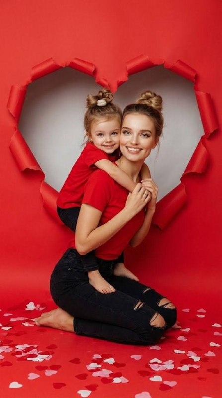 ! ♥️ 👉Создать в 1 клик (для Мамы + Дочка) Модель: Banana 🍌 Промт: Используй референс личных фото мамы и дочери как эталон внешности. Сохрани узнаваемость обеих: черты лица, форму глаз и губ, брови, тон кожи, прическу и фактуру волос, а также мимику как на референсах. Не менять возраст. Реалистичная кожа с естественной текстурой, без пластикового эффекта. Сцена: праздничная студийная фотосессия ко Дню святого Валентина. В кадре мама и маленькая дочь. Мама босиком, стоит на коленях. На маме повседневная красная футболка с коротким рукавом и черные узкие джинсы с рваными элементами. Ребенок в такой же красной футболке сидит у мамы на спине в позе “верхом”, обнимает маму, улыбается, выглядит естественно и безопасно. Внешность: лица, волосы, цвет кожи и особенности внешности мамы и дочери берутся из референсов. Прическа дочери и аксессуар (бантик) должны быть сохранены и выглядеть натурально, без искажений. Декорация: мама и дочь находятся внутри большого сердечного “окна” из красной