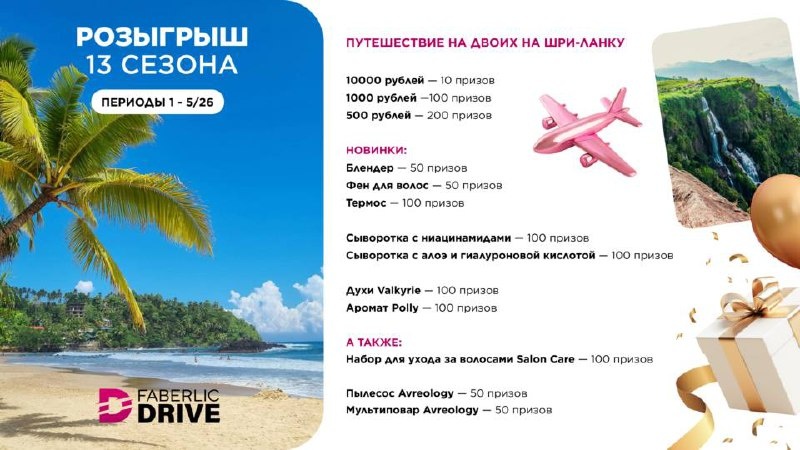 💙💙 💙💙💙💙💙 Розыгрыш по итогам 13 сезона Faberlic Drive По итогам 13 сезона Faberlic Drive (1/26-5/26) состоится большой розыгрыш призов! Как участвовать: 💙Выполняйте 100 баллов ЛО, 💙Авторизуйтесь на платформе Faberlic Drive https://drive.faberlic.com Каждый период участвуйте в активностях Faberlic Drive Накапливайте золотые драйвы Каждый золотой драйв имеет свой уникальный номер, среди которых будет происходить розыгрыш с помощью генератора случайных чисел. За каждый золотой драйв можно выиграть 1 приз. Если у вас несколько золотых драйвов, вы можете выиграть несколько призов! Призы: Путешествие на Шри-Ланку для двоих 💙 10000 рублей - 10 призов 💙1000 рублей - 100 призов 💙 500 рублей- 200 призов Новинки: 💙Блендер - 50 призов 💙Фен для волос - 50 призов 💙Термос - 100 призов 💙Сыворотка с ниацинамидами - 100 призов 💙Сыворотка с алоэ и гиалуроновой кислотой - 100 призов 💙Духи Valkyrie, арт. 3755 - 100 призов штук 💙Аромат Polly - 100 призов А также: 💙Набор для у