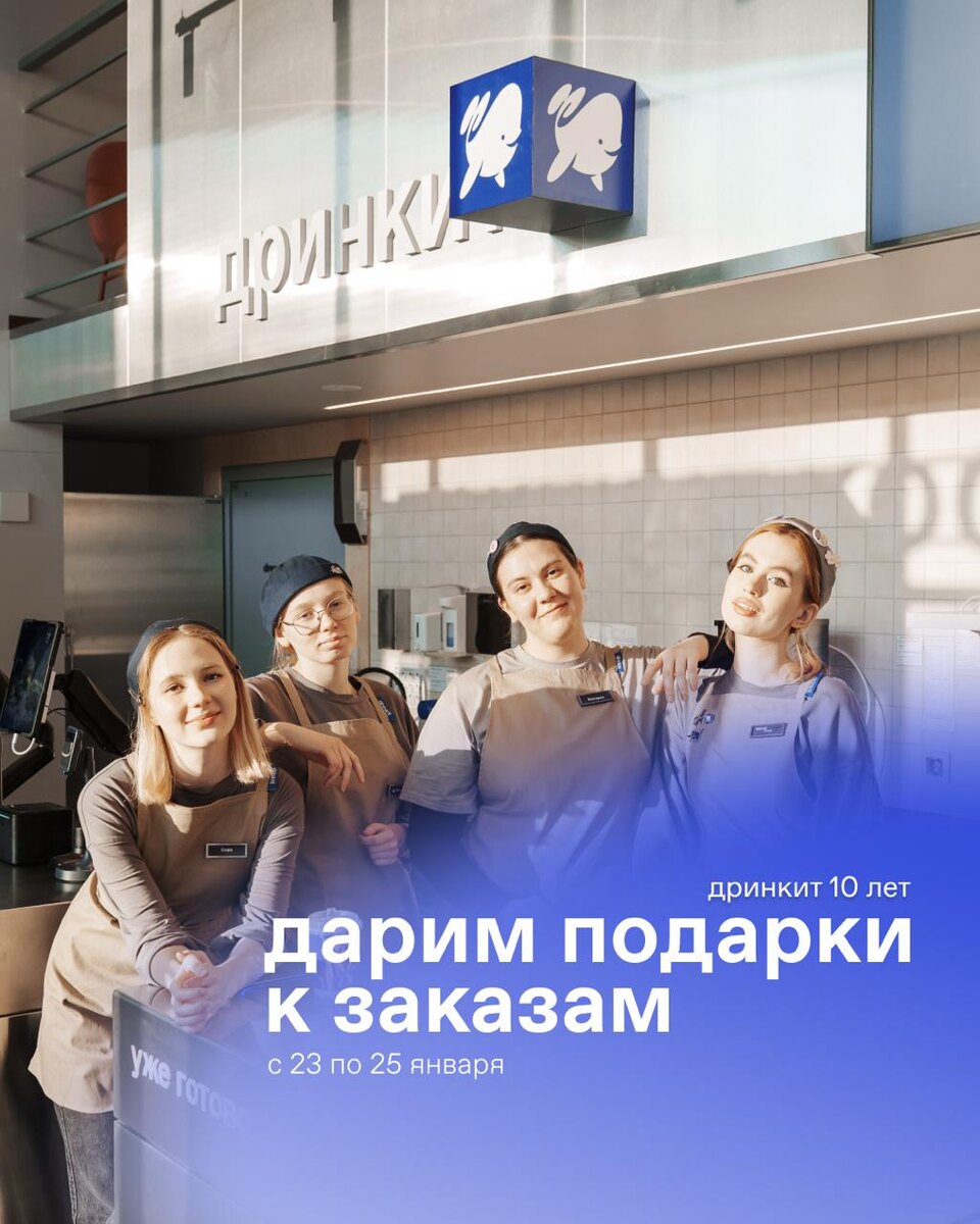 С 23 по 25 января «Дринкит» отмечает 10-летие и дарит подарки к случайным заказам во всех кофейнях Самары. 🔵Ленинградская, 29 🔵Московское шоссе, 41 🔵Галактионовская, 130 Подарки будут разными: от приятных мелочей до уникального мерча. Никаких условий — нужно просто оформить заказ, а дальше все решит удача. @somsomsom