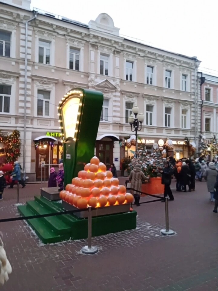 Но тоже тьма людей. Красиво украшено здание библиотеки. Еще мандариновая елочка. Арбатский котик. Выходим с Арбата, наконец то стемнело.