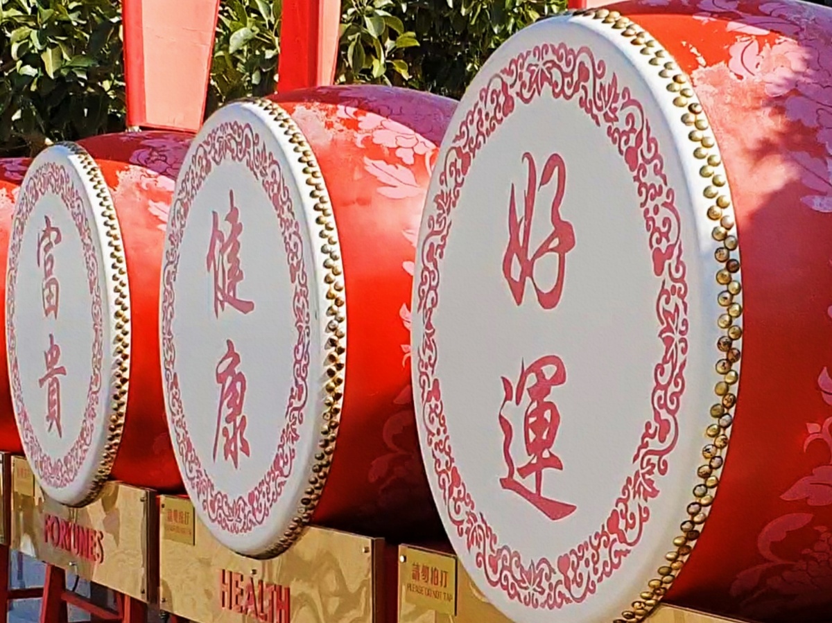 Чуть дальше - большие красно-белые барабаны. Это молитвенные барабаны. Внутри них — свитки с мантрами. Считается, что, вращая или ударяя по барабану, вы «произносите» молитву, даже не зная слов. Так что это не про «получить желаемое», а скорее про накопление благой кармы.