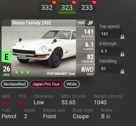 Редкость от E до D. Первая категория авто хоть на что-то годные. Nissan Z432 Fairlady: Несмотря на то, что ранг не особо высокий всего 26RQ машинка хороша для извилистых трасс и некоторых слаломов. Выдаётся в карьере изначально и лучше её не продавать- пригодится и в клубах и некоторых сетевых гонках. Прокачка- 323. Это не дрэговое авто! Nissan EXA Turbo(N12): Автомобиль хорош на извилистых трассах, слаломе и пригодится и в карьере и в испытаниях и поначалу в некоторых гонках сети, далее только клубные заезды. Прокачка 323. Остальные не пробовал так что не знаю, эти же хорошо себя показали. Авто, что лучше всегда иметь в гараже(D- класс): В целом, очень полезный автомобиль. По информации с сайта TD Records: Хотя «Кобра» уже не так актуальна для 1/4, как раньше (её обошёл 396-й), это не значит, что «Кобра» не показывает клыки своим противникам — Aston Martin DB4 и Virage, которые борются с ней за титул чемпиона Великобритании по дрэг-рейсингу. Очень низкий показатель 0–60 позволяет AC