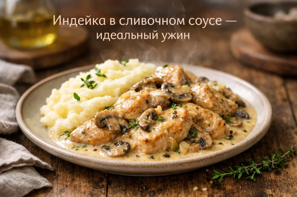 Так родился рецепт, которым хочу поделиться. Индейка в сливочном соусе с грибами стала моим фирменным блюдом для тех вечеров, когда хочется чего-то особенного, но без лишних сложностей. Готовится относительно быстро, не требует редких ингредиентов, а результат неизменно радует и меня, и гостей.
