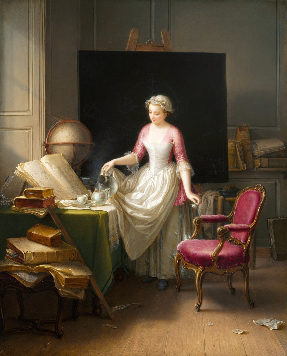 Феличе Скьявони (1803–1881) сначала учился у своего отца, известного художника Натале Скьявон (1777–1858). В 1821 году он переехал в Венецию, где создавал алтарные образы и изображения Девы Марии и святых в стиле, напоминающем итальянскую живопись XVI века, особенно Рафаэля. В 1840 году его пригласили в Россию, где он жил до 1847 года, создав несколько получивших признание картин с изображением царской семьи. Жанровые сцены, которые он писал в середине века, раскрыли новую сторону его художественного мастерства и таланта. Поза служанки, готовящей чай в кабинете учёного, более изящна и непринужденна, чем это требовалось в случае парадных портретов, заказанных состоятельными людьми. Стопки книг и научные инструменты рассказывают нам кое-что об отсутствующем хозяине комнаты. Кажущаяся неупорядоченность пространственной композиции и игра света и тени здесь заменяют замкнутую композицию, использовавшуюся в его ранних работах. В подобных жанровых сценах Скьявони, даже тех, которые напо