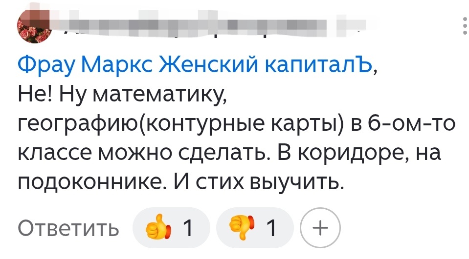 Я понимаю, что у каждого свои тараканы, свои триггеры и свои воспоминания о прошлом, которые очень хотелось бы забыть или как-то "переделать". Именно такой "переделкой" часто и занимается психика. Подсознательно. Кому-то очень нужно прокричать в онлайн-пространство, что школа далась с полпинка, легко и непринуждённо – "на подоконнике". Или для чего-то сочинить написать в комментарии о том, как за одну перемену (10 мин) в 6-м классе одной рукой писалось д\з по математике, другой – рисовались контурные карты и тут же третьей рукой выучивалось наизусть "Сижу за решёткой в темнице сырой..."