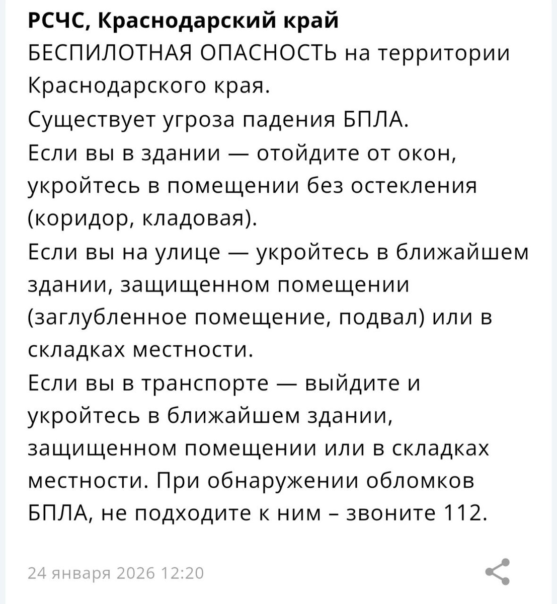 На территории Краснодарского края объявлена «Беспилотная опасность».