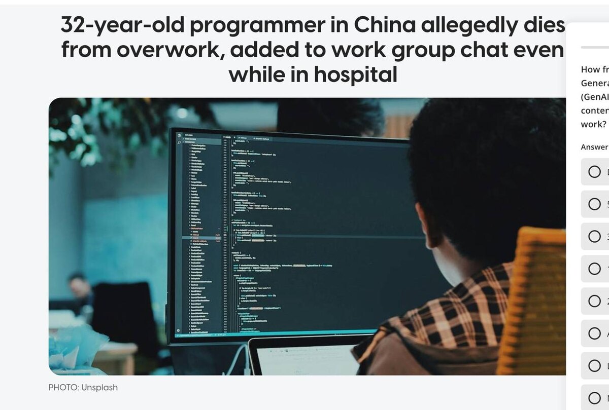 32-летний программист после повышения стал регулярно задерживаться, работать по выходным и жить в режиме “ещё один таск и спать”. В итоге его госпитализировали из-за состояния здоровья, связанного с перегрузками. Самый абсурдный момент, даже в этот период коллеги добавили его в ещё один рабочий чат. Это напоминание о простой вещи: никакая задача не стоит здоровья. “Геройство” на работе часто заканчивается тем, что система продолжает крутиться, а человек нет. Иногда лучший профессиональный навык это вовремя закрыть ноутбук. https://www.asiaone.com/china/32-year-old-programmer-china-allegedly-dies-overwork-added-work-group-chat-even-while