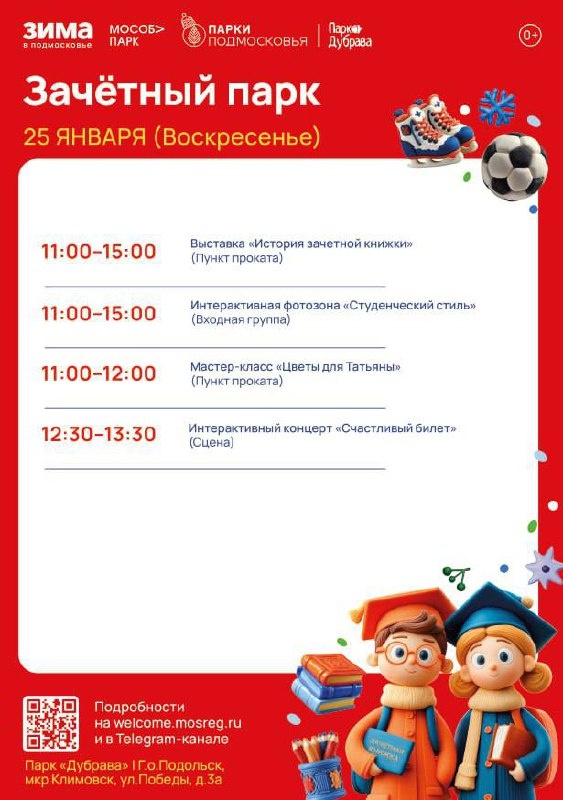 ✨ 25 января в воскресенье встречаемся в парке Дубрава ✅ Что вас ждет? - ✨ Мастер-классы, где вы сможете проявить себя и научиться чему-то новому - 📸 Фотозона, посвященную истории выпускного альбома, погрузитесь в атмосферу прошлых лет - ⭐ Интерактивный концерт, где ваша главная задача — весело провести время и заработать заслуженный зачет - 😊 И, конечно же, отличное настроение, заряд бодрости и море позитива! 🚫 Возраст: 0+ 📆 25.01.2026 🕒 11:00 🏢 Парк культуры и отдыха «Дубрава» 📍 г.о.Подольск, микрорайон Климовск, ул. Победы, д.3 💰 Вход свободный❗️ ⭐Поддержать канал голосом 🍰Где поесть в Подольске ✅ Мероприятия Подольск https://dzen.ru/id/66ed500f7b5671493eca3fd6 http://vk.com/podolsk_events http://dzen.ru/podolsk_events