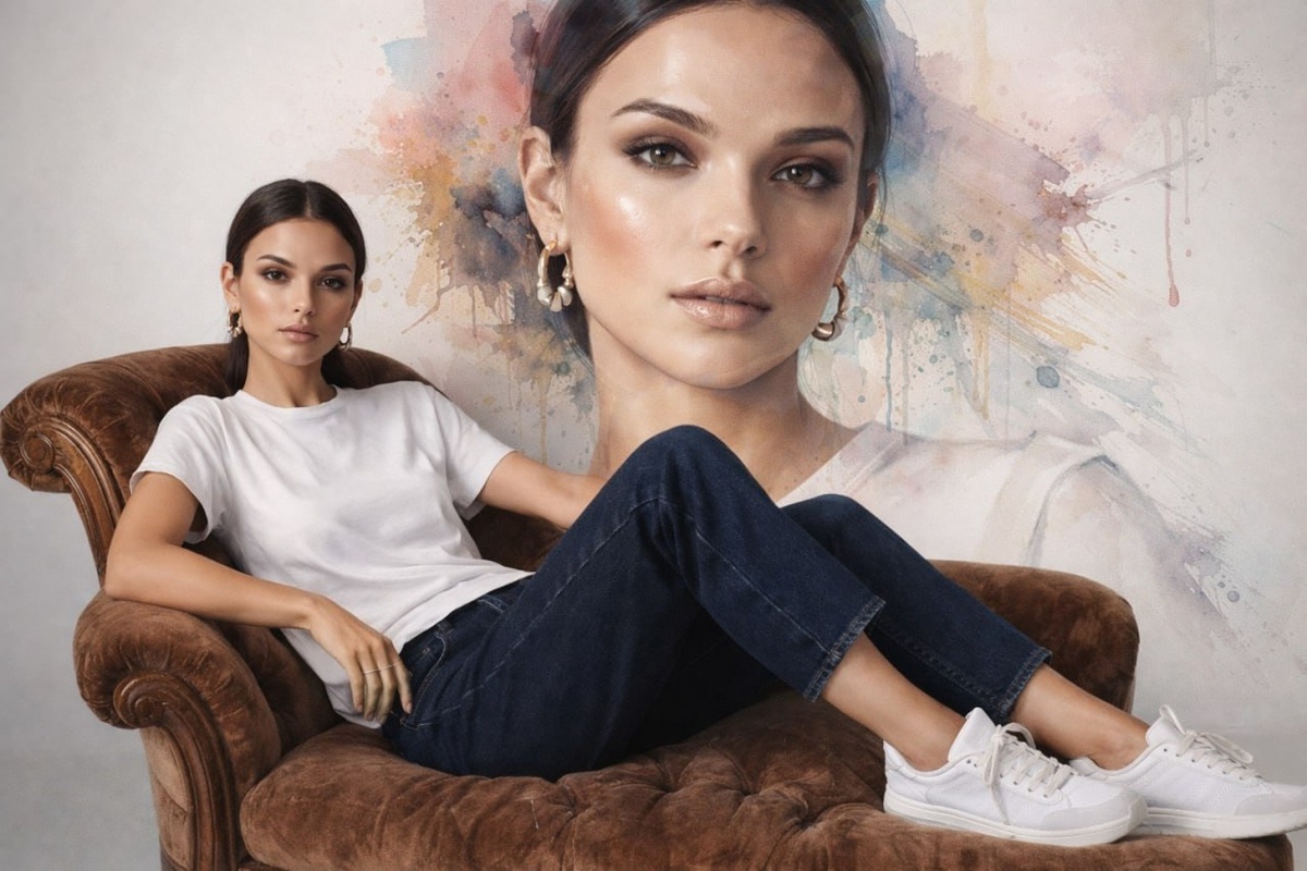 🔥 Смешиваем гиперреализм и акварельную абстракцию. Этот промпт превратит обычное селфи в дорогой арт-объект для галереи или обложки. Закидываем фото в @SnapToVideo_bot, выкручиваем сходство на максимум и получаем чистый стиль. ⚡️ Используя загруженное селфи в качестве точного эталона лица со 100-процентным совпадением (--face_fidelity 1.0), создайте фотографию по описанию, сохранив полное сходство с оригиналом. Кинематографичный [студийный портрет] модели в интерьере мастерской. Модель [лежит на старинном коричневом кожаном шезлонге] в [расслабленной, но уверенной позе]. На модели надета [белая базовая футболка, темно-синие джинсы прямого кроя и белые минималистичные кроссовки]. [Волосы уложены естественно, спокойный прямой взгляд в камеру]. Фон — чистая белая студия, на которой расположена [крупномасштабная акварельная фреска с лицом этой же модели] в [пастельных розовых, голубых и золотистых тонах]. Видны выразительные мазки кисти и тонкие капли краски. [Мягкое рассеянное студийно