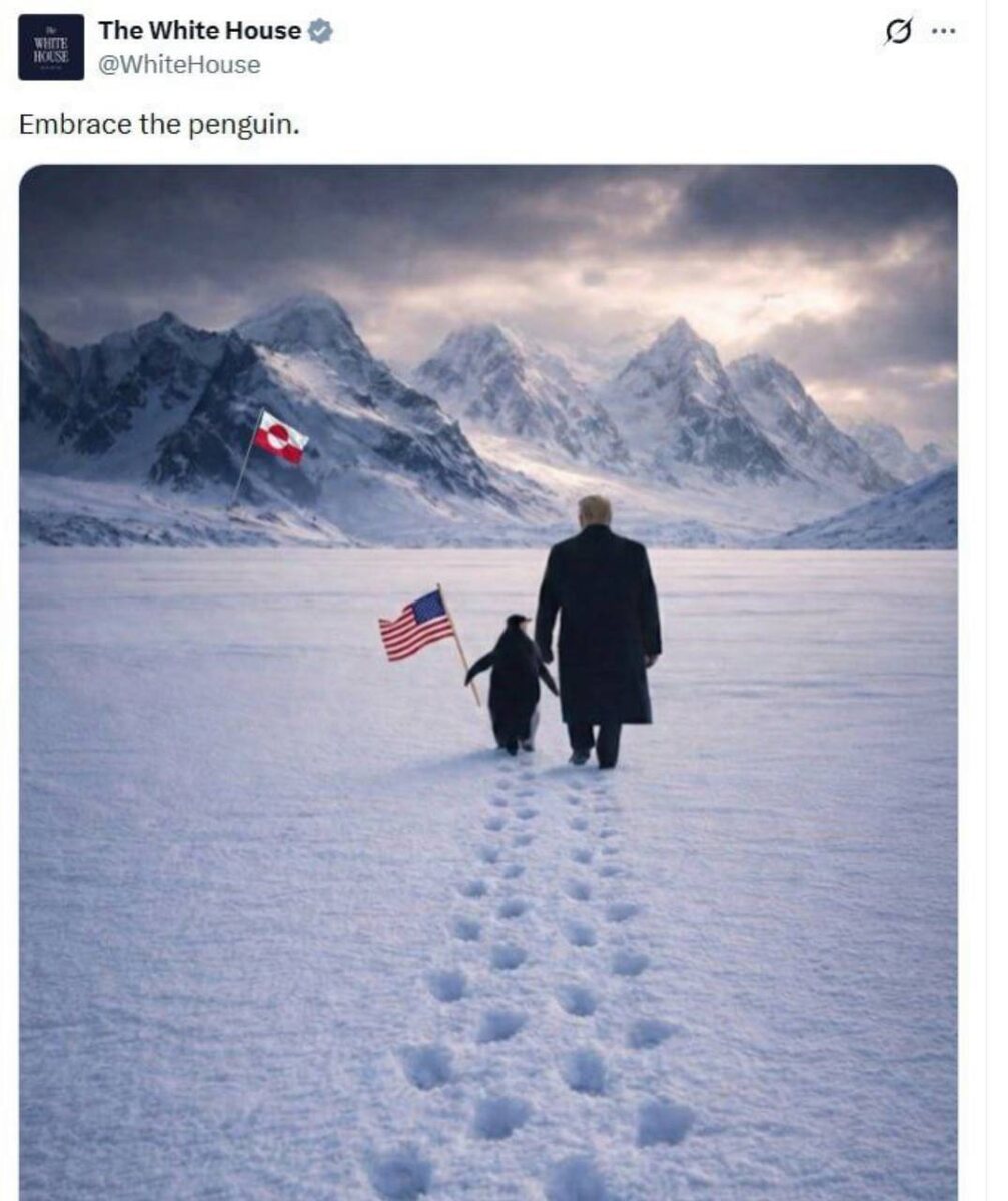 )) Я не могу поверить в то, что сотрудники Белого Дома не в курсе, что пингвины живут в Антарктиде, а не в Гренландии, поэтому предлагаю конкурс на интерпретацию этой картинки. Мне кажется, это библейский сюжет – «Let my people go. Дональд Трамп выводит пингвинов из Антарктиды, чтобы привести их на землю обетованную в Гренландии». Тем более, это вяжется, в целом, с внешнеполитическим контекстом. Вы можете свои накидывать варианты, почему президент США выступает с этим южнополушарским животным в Северном полушарии. За лучшие ответы будет моя личная благодарность. А если вы в Москве, то даже кого-нибудь приглашу на свои спектакли. Фотографию взял у своего друга и непримиримого политического оппонента Трофима Татаренкова. Он разродился, как вы понимаете, жестким постом на эту тему. Тоже можете ознакомиться.