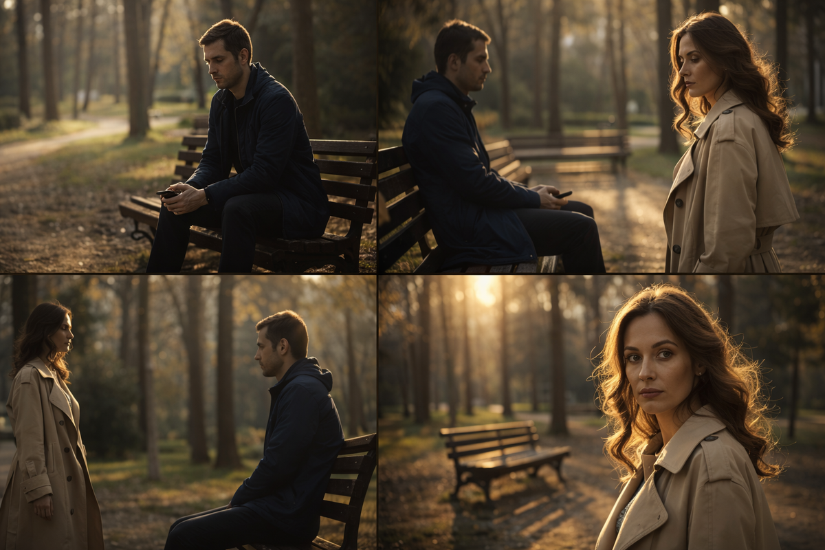 Лера не спорила. Она давно знала: если Алину начать убеждать, она замкнётся ещё сильнее. Они пошли по аллее, где стояли старые сосны. Вдалеке была лавочка, на которой сидел мужчина в тёмной куртке, склонившись над телефоном. Вроде бы обычный кадр: парк, лавочка, человек. Но Алину почему-то кольнуло — как будто в этой сцене было что-то неправильное.