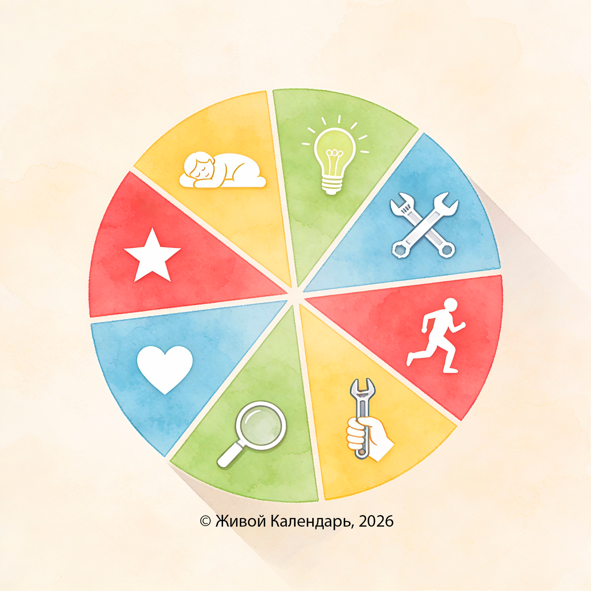 Устали быть «продуктивными» каждый день? Осьмица учит ловить волну — когда давить на газ, а когда вовремя нажать на тормоз. Это 8-дневный цикл внутри лунного месяца. Он синхронизирован с фазами Луны: Недельник всегда совпадает с новолунием, полнолунием или четвертью.
