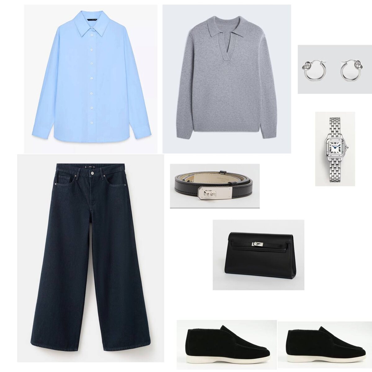 Высокая талия + широкие, тяжёлые по ткани брюки дают эффект длины и статуса. Ноги кажутся бесконечными, линия бёдер мягкая, без резкости. Это тот самый “дорогой архитектурный силуэт. 🔹 Голубая рубашка Не просто база — это интеллектуальная женственность. Мягкий объём в рукавах добавляет воздуха, а застёгнутый воротник делает образ собранным, не бытовым. Цвет освежает лицо и красиво контрастирует с тёмным низом. 🔹 Свитер на плечах Вот тут вообще уровень стайлинга 🔥 Это создаёт: • слой • глубину • ощущение европейского шика “мне не нужно стараться” И при этом смягчает строгость рубашки. Очень в духе old money. 🔹 Тёмный низ + чёрная сумка Низ визуально «заземляет» образ. Сумка жёсткой формы добавляет структуры, чтобы широкие брюки не делали образ слишком расслабленным. 🔹 Украшения базовые: часы и серьги, по минимуму. 🩷 мне нравится.