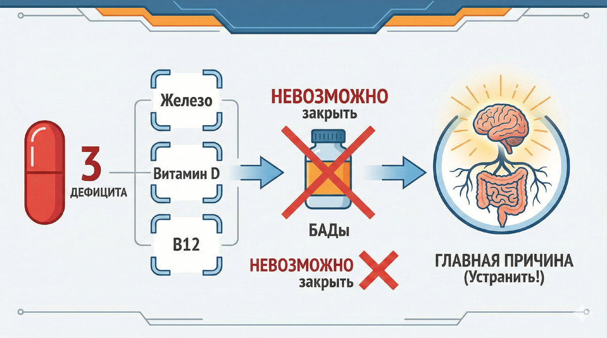 Вы пьете железо, магний, витамин D. Месяцами. Горстями. А анализы как были плохими, так и остались. Деньги потрачены. Результата ноль. И вы думаете, что дело в качестве добавок или дозировках. Но проблема глубже. Читайте описание — там правда которая изменит ваш подход к восстановлению здоровья. ЖЕЛЕЗО И РАЗРУШЕННЫЙ КИШЕЧНИК Вы пьете железо от анемии. Дорогое, хелатное, самое усваиваемое. А гемоглобин не растет. Волосы сыпятся. Усталость не проходит. Почему? Потому что железо всасывается в двенадцатиперстной кишке и тонком кишечнике. Если там воспаление, СИБР, атрофия слизистой — железо просто не может усвоиться. Вы можете пить его годами. ❗️Главная причина: нарушенное всасывание в кишечнике. Пока не восстановите слизистую, не вылечите СИБР, не наладите пищеварение — железо будет проходить транзитом. Сначала кишечник. Потом железо. Инструкция по СИБР https://taplink.cc/marina_shestakova/p/b5bc21/
