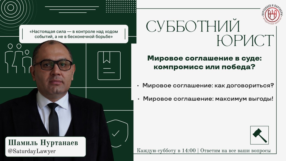 ? Сегодня 24 января в 14:00 вы узнаете ответ на этот и на многие другие вопросы на "Субботнего Юриста" ⚖️ Эфир проведет юрист с более, чем 20 летней практикой – Шамиль Нуртанаев (нажав на имя вы можете узнать о юристе больше). Тема эфира: «Выигрыш без суда» 📝 Вот основные вопросы, которые мы обсудим в эфире: 1. Мировое соглашение: как договориться? 2. Мировое соглашение: максимум выгоды! Также, каждый может задать свой вопрос любым удобным для вас способом, перейдя по ссылке: https://clck.ru/3ByDxh Или же просто напишите вопрос в комментариях к посту Получите юридическую консультацию, не выходя из дома! 🎥 Записи эфиров на нашем Rutube: https://rutube.ru/channel/40148985/ VK Видео: https://vk.com/video/@vk.nurtanaev Дзен: https://clck.ru/3DQGpA ⚡️⚡️⚡️⚡️Трансляция пройдет на платформе VK Видео и Rutube, по ссылкам ниже👇 ✅ Присоединяйтесь к эфиру сегодня 24 января 2025 года в 14:00, будет интересно: https://vkvideo.ru/@vk.nurtanaev - VK Видео https://rutube.ru/channel/401489